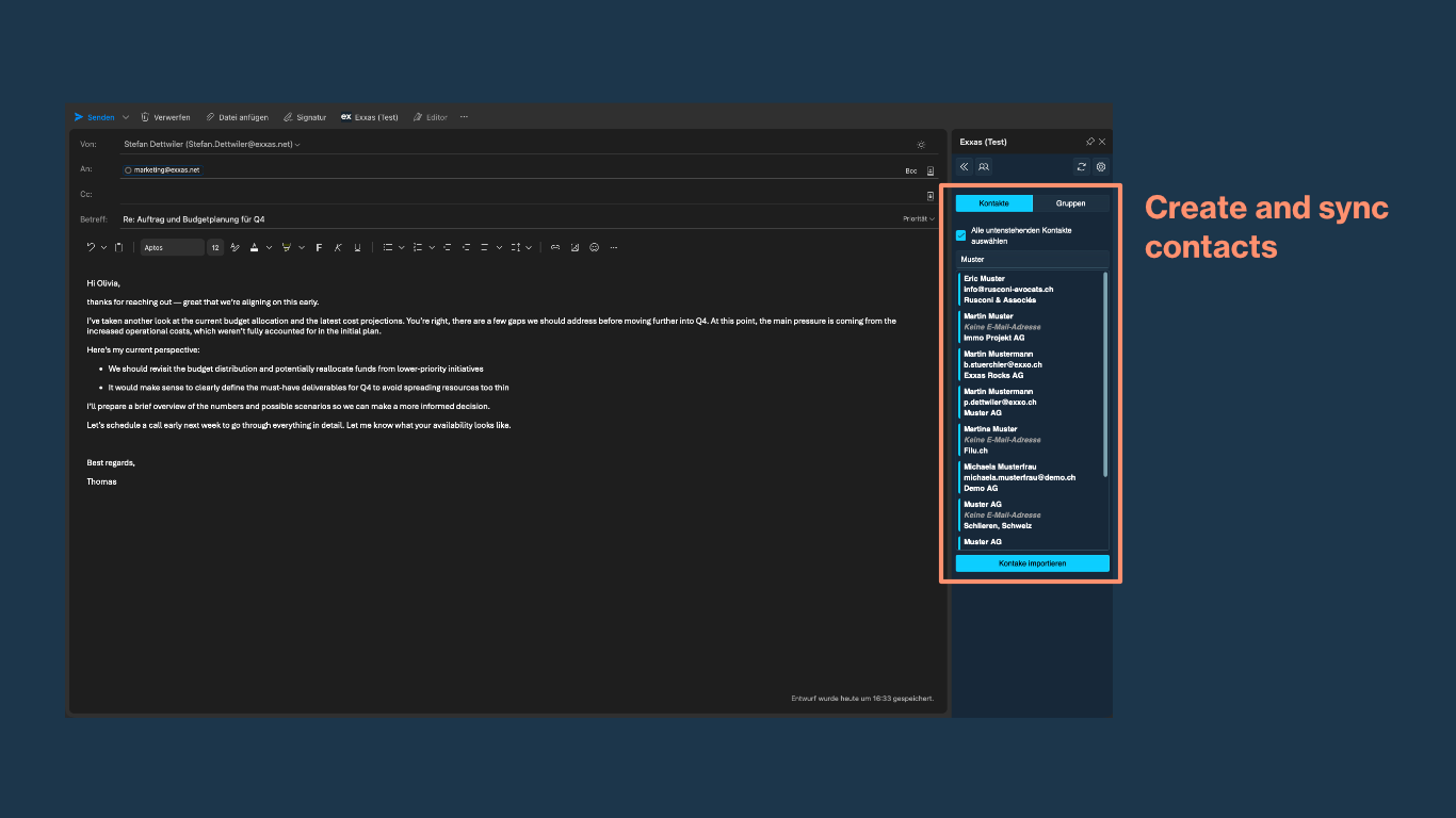 Neue Kontakte direkt im Add-in erstellen und mit Exxas synchronisieren.