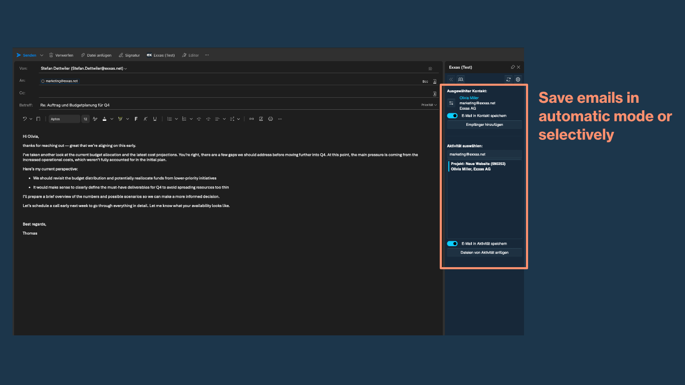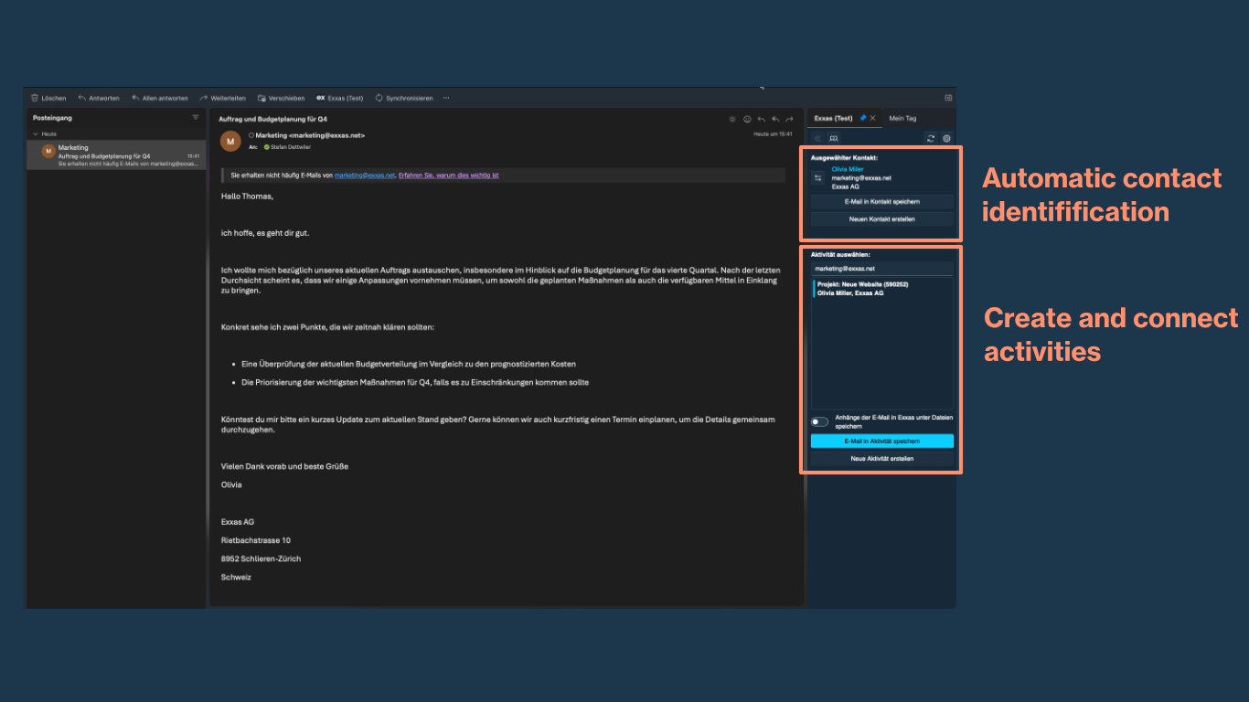 E-Mails in Exxas speichern, Kontakte synchronisieren, Dokumente anhängen und Aktivitäten erstellen – mit dem neuen Add-in sind Exxas und Outlook so eng verknüpft wie noch nie. Und das für Benutzer des neuen Microsoft Outlook für Windows und Mac, sowohl in der installierten Desktop-App als auch im Webbrowser.