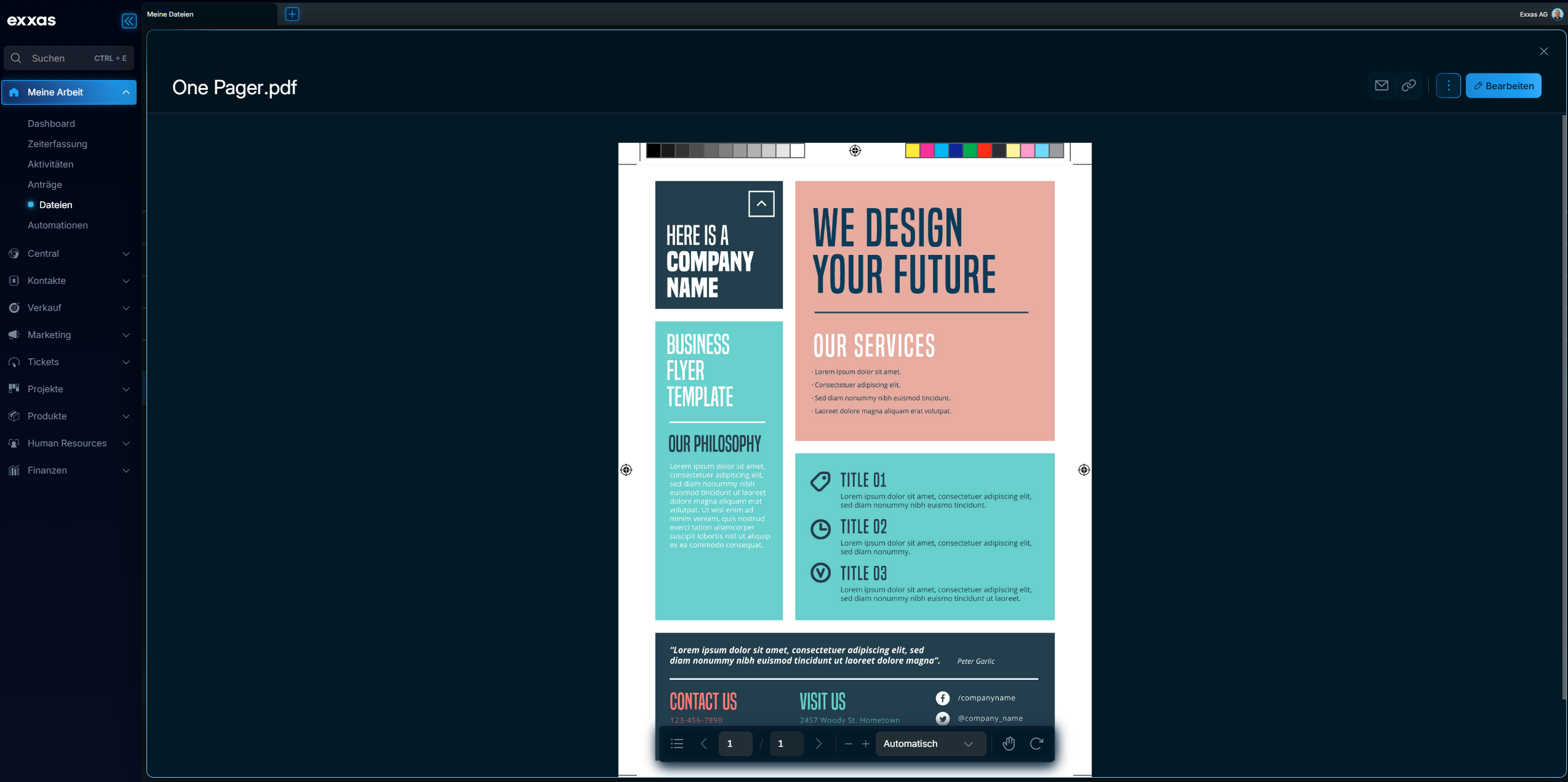 Dank dem Speichern und Teilen von Dateien ist Exxas eines der wenigen ERP-Systeme, das wirklich alle Geschäftsdaten an einem Ort vereint. Mit der neuen Dokumentenvorschau können Word-, Excel-, PowerPoint- und PDF-Dokumente, Bilder und Videos direkt in Exxas angezeigt werden. PDF, Bilder und Videos werden immer zuerst in der Vorschau geöffnet. Bei Word-, Excel- und PowerPoint-Dokumenten öffnet sich der Bearbeiten-Modus durch Doppelklick. Bei diesen Dokumenten muss die Vorschau über das Kontextmenü geöffnet werden.