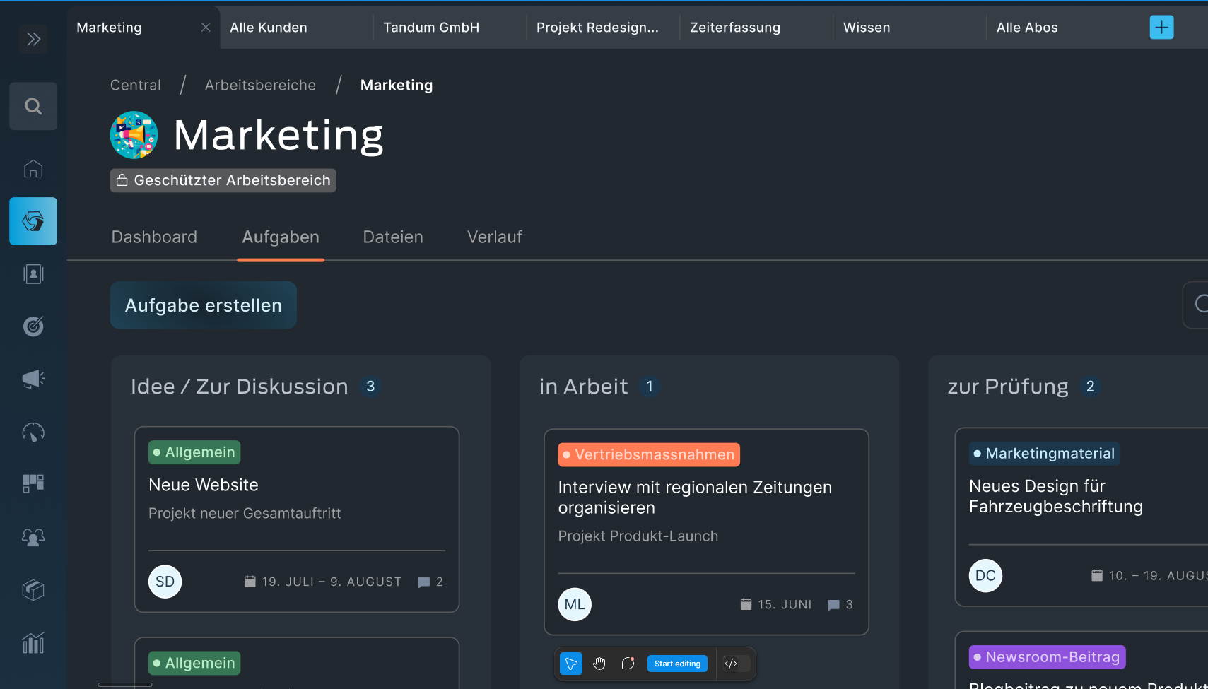 E-Mails, Kommentare und Aktionen in Aktivitäten werden neu in verknüpften Unternehmen und Kontakten angezeigt. Der Verlauf wird damit zum ultimativen Protokoll der Vergangenheit eines Kunden oder einer Aktivität.