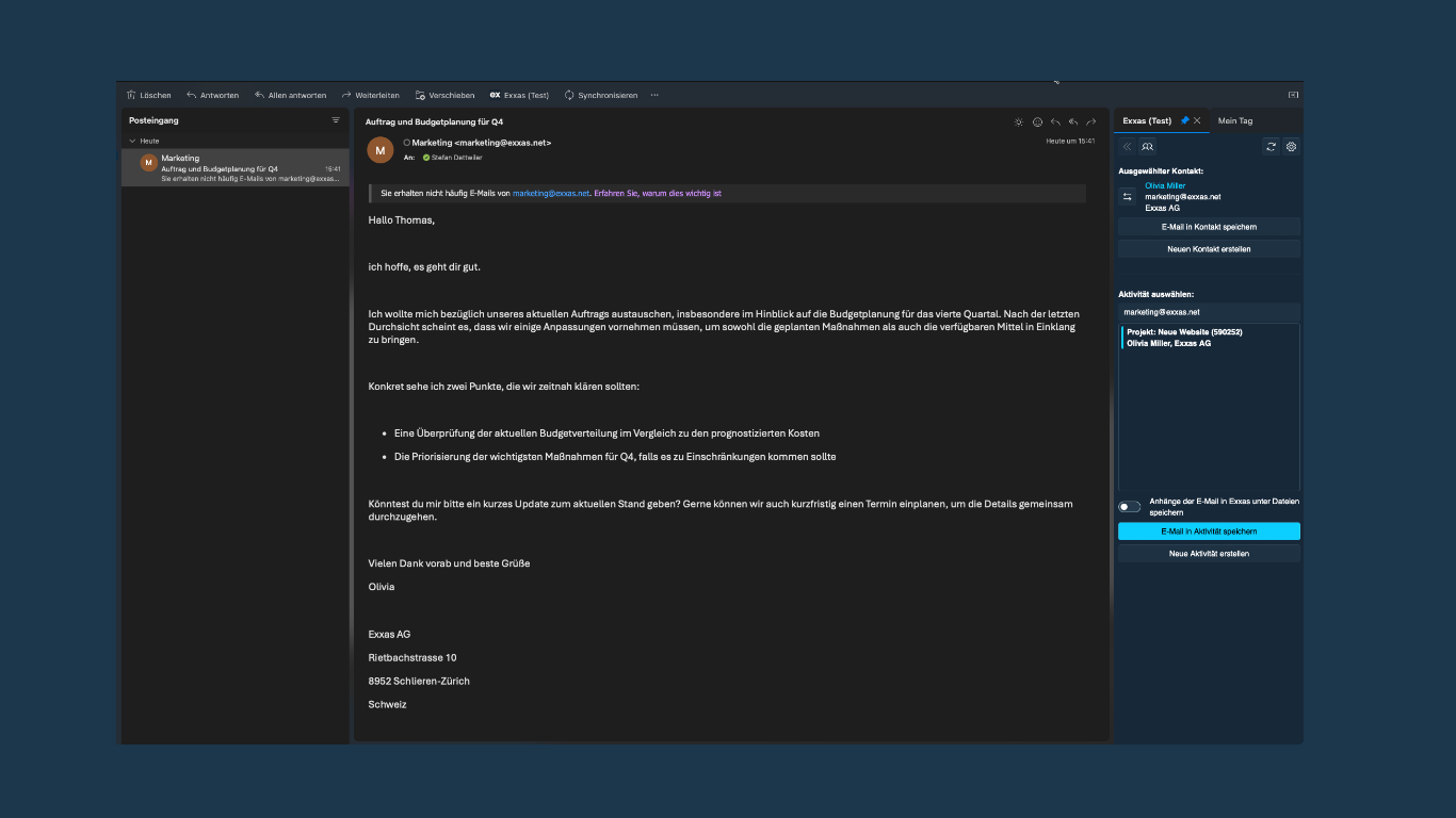 Benutzer speichern mit dem neuen Outlook Add-in E-Mails in Exxas, synchronisieren Kontakte, hängen Dokumente aus Exxas ihren E-Mails an und erstellen aus E-Mails direkt Aktivitäten und Kontakte in Exxas.